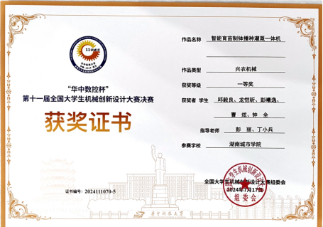 (通讯员 彭丽)7月17日,第十一届全国大学生机械创新设计大赛决赛在华中科技大学圆满闭幕。由彭丽和丁小兵老师指导,邱毅良、龙恺昕、彭曦逸、曹炫、钟全五位同学完成的万象城手机网页版登录入口参赛作品《智能育苗制钵播种灌溉一体机》,以湖南省第一名的好成绩入围全国总决赛,经过决赛的两轮精彩比拼,不负众望斩获最高奖项:全国一等奖,实现万象城手机网页版登录入口在该赛事上历史性的突破。